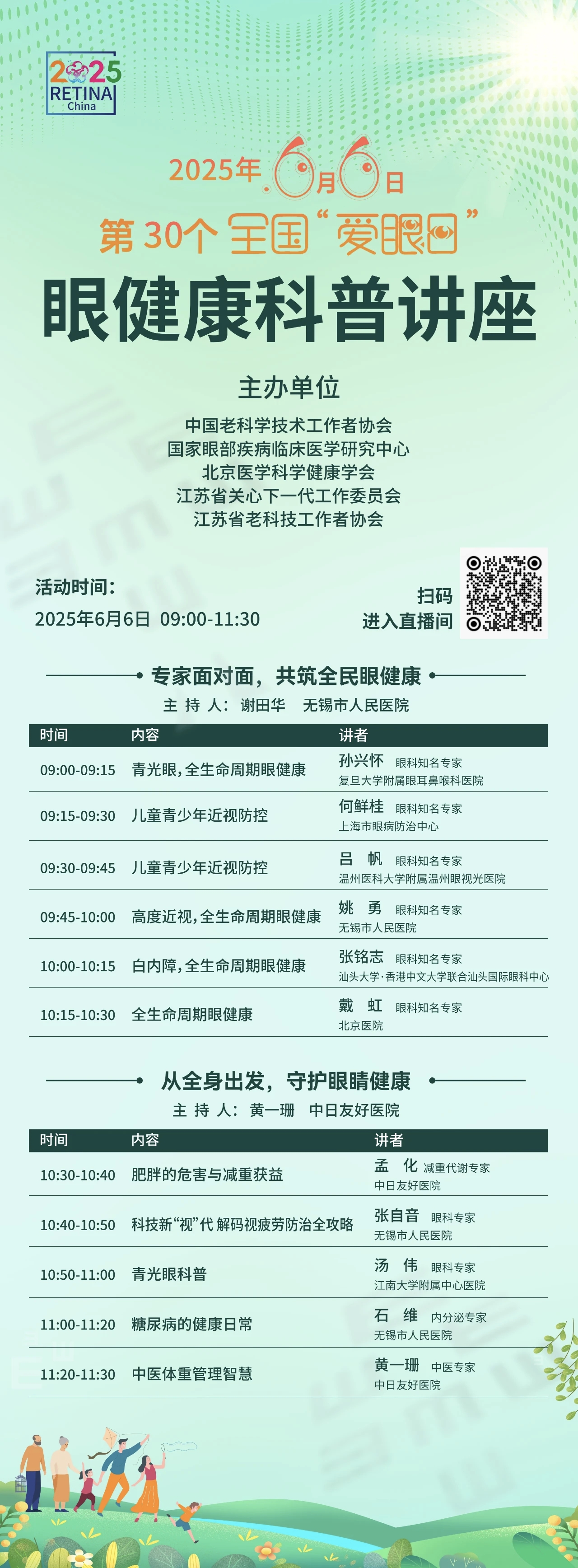 2025年6月6日,我们将迎来第30个全国“爱眼日”,今年的爱眼日主题为“关注普遍的眼健康”,旨在唤起全社会对全年龄段、全生命周期眼健康的重视与关怀。为积极响应这一号召,广泛宣传普及眼健康科学知识,切实增强全民爱眼护眼意识,中国老科学技术工作者协会、国家眼部疾病临床医学研究中心、北京医学科学健康学会、江苏省关心下一代工作委员会、江苏省老科技工作者协会联合策划了“6.6全国爱眼日”眼健康线上科普讲座活动,活动聚焦全年龄段眼健康问题,邀请眼健康及减重代谢、内分泌、中医领域的权威专家,为公众讲解眼健康知识,共筑光明未来。